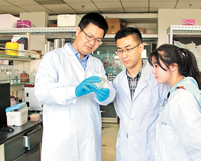 施一(左)和同事在實驗室觀察實驗成果。
