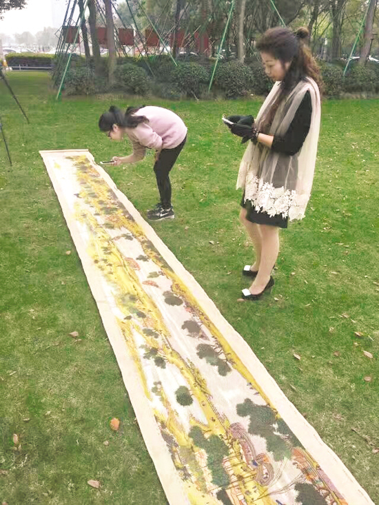 這位曬作品的市民,是居住在臺州經濟開發區市民廣場附近的陶女士。應朋友要求,她將自己的十字繡作品拿到室外鋪開給大家欣賞,地點就在市民廣場的一處草坪上,十字繡畫卷鋪開之后,立即吸引了許多人駐步圍觀。
