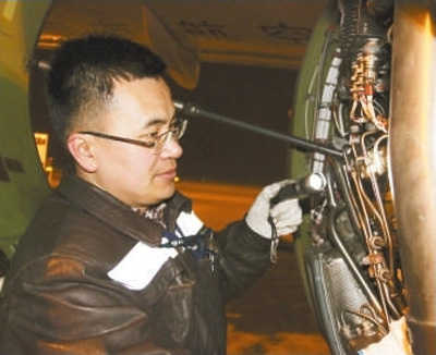 飛機(jī)檢修員高永德正在檢查飛機(jī)發(fā)動機(jī)。