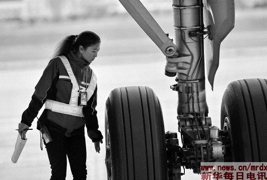 瑪麗亞在檢查飛機(jī)起落架輪胎(3月6日攝)?! ⌒氯A社記者張汝鋒攝