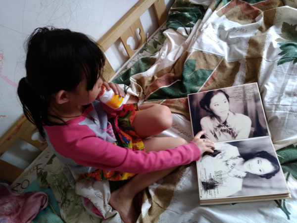 女兒在看媽媽年輕時的藝術照,很多人都說她遺傳了媽媽的長相。