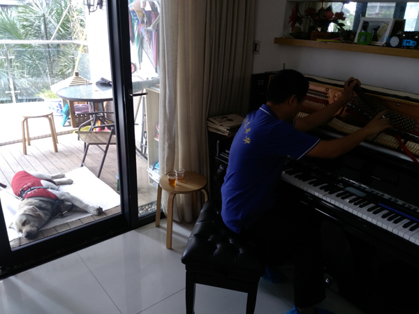 幺傳錫調音時,奧斯卡在一旁安靜等著。
