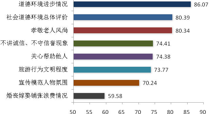 調查結果顯示,臺州市社會道德環境滿意度為75.12%,比去年提高2.1%。八項指標從高到低排列依次是道德環境進步情況86.07%、社會道德環境總體評價80.39%、孝敬老人風尚80.34%、不講誠信不守信譽現象74.41%、關心幫助他人74.38%、旅游行為文明程度73.77%、宣傳模范人物氛圍%70.24%、婚喪嫁娶鋪張浪費情況59.58%,最高和最低兩項相差26.49個點。