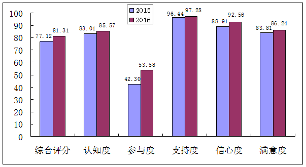 調查結果顯示,臺州市民眾對"五水共治"的認知度、參與度、支持度、信心度和滿意度全面提升,分別為85.57、53.58、97.28、92.56和86.24,較去年同期分別提升2.56、11.28、0.84、3.65、2.43個點,綜合評分為81.31,較去年同期提升4.19個點。