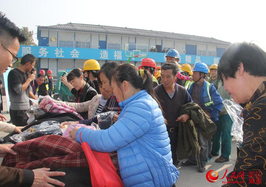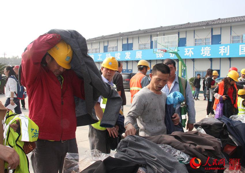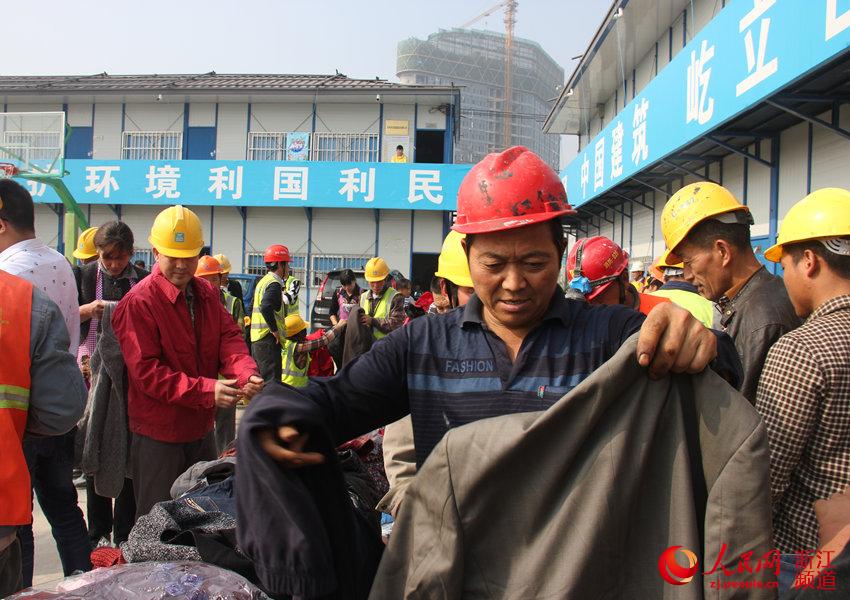 人民網杭州11月18日電 當一件件冬衣送到建筑工人們手中時,他們的臉上都洋溢著燦爛的笑容。上午10點半,在杭州“智慧之門”項目現場,來自工信保、一道公益、衣衣不舍等公益組織聯合捐贈的冬衣被整齊的擺放在一起,等待工人們前來挑選。