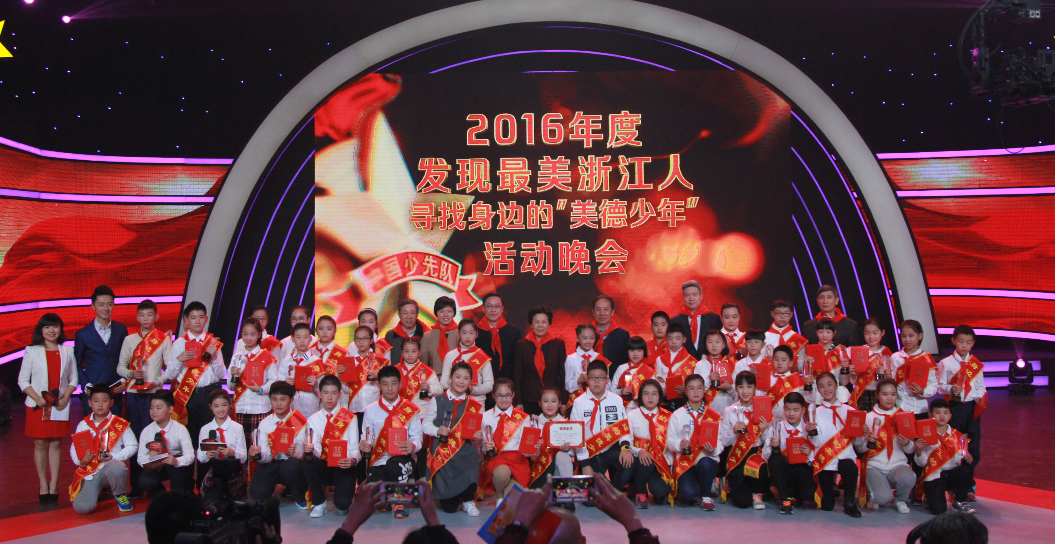 11月23日晚,由浙江省文明辦、團省委、省廣電集團聯合舉辦的“2016年度發現最美浙江人——尋找身邊的美德少年”活動晚會在浙江廣電集團演播廳舉行。晚會圍繞“紅領巾相約中國夢,爭做三有三熱愛好少年”的主題,分“夢想的種子、品格的種子、學習的種子”三個篇章展開,現場揭曉了2016年“最美浙江人·身邊的美德少年”40名獲獎者名單,通過“美德少年”候選人事跡展播、現場采訪等形式,引導廣大少年兒童學習“最美人物”,唱響“最美聲音”,傳遞“最美精神”,以“最美精神”引領少年兒童的“中國夢”。
