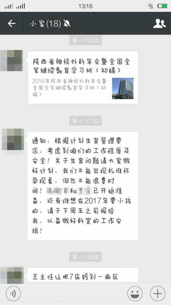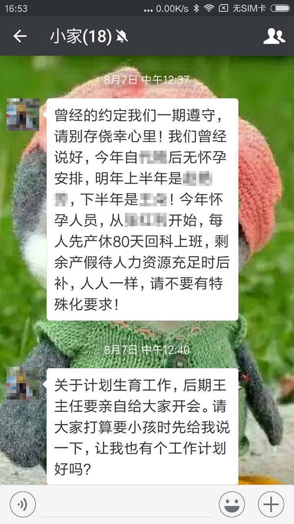 ↑郭女士的工作群里,領導發布的計劃懷孕的通知。