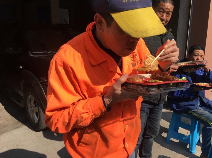 中午11點,藍陳風一家將熱騰騰的飯菜打包好送到了云和縣環(huán)衛(wèi)所,陸續(xù)趕回所來的50多名環(huán)衛(wèi)工人領(lǐng)到了自己的愛心盒飯。