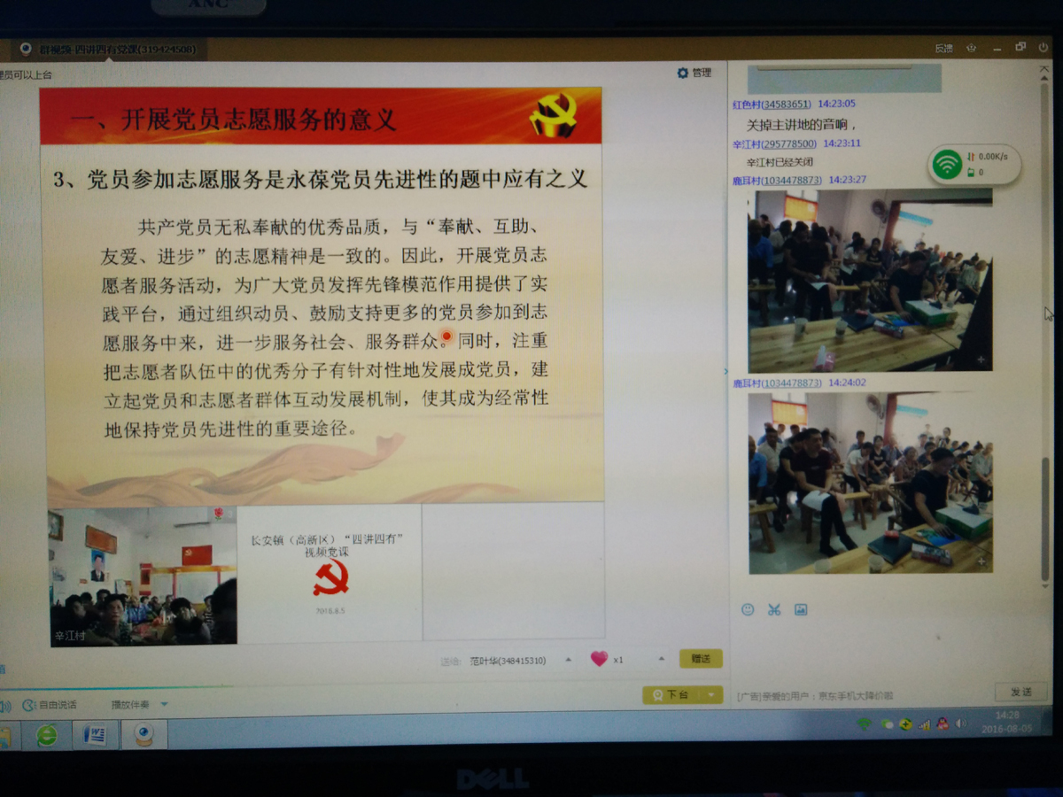 近日,利用QQ群的視頻直播功能,該鎮(區)的25個村(社區)黨組織借助網絡視頻播放這種形式,開辦了首期“四講四有”基層視頻黨課,1000多名黨員實時收看收聽了“微黨課”。