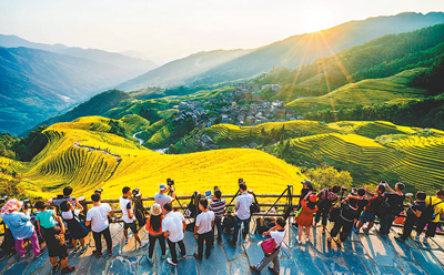 游客在廣西龍勝各族自治縣龍脊梯田景區游覽拍照。