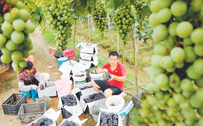 南康市三江鄉明輝葡萄基地主人陳春明(右)在收獲葡萄。宗家財 楊曉明攝