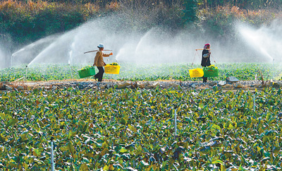 全南縣中寨鄉田新生態農業種植基地的菜農們在挑運蔬菜。鐘炆秦攝