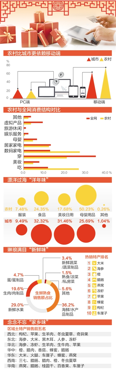 同時,隨著電商渠道下沉和冷鏈物流發展,更多的鄉村也逐漸享受到物流的便捷。“咱們屯里人”購買力繼續爆棚,就連漂洋過海的洋年貨,買起來也不手軟。網上追“鮮”的生活,不僅是城鎮居民的常態,也成為鄉村百姓的時髦。