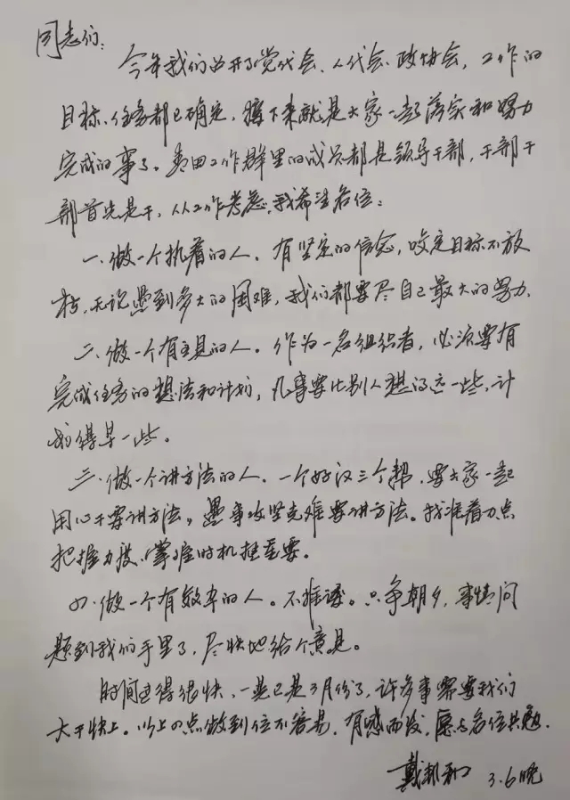 3月6日是青田縣的周一夜學日,在這個夜學制度執行的第十七個年頭,在全年各項工作全面啟動之際,履新不久的中共青田縣委書記戴邦和手寫了一封寄語全縣干部的“工作心得”。