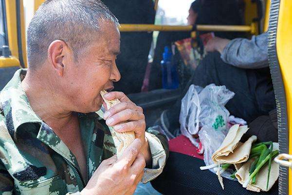 就在范雨素走紅的這兩天,另一組照片也在網(wǎng)上流傳,這是一組在杭州務(wù)工的臨沂農(nóng)民工,五六十歲的年紀(jì)。每天跟車鋪設(shè)電纜,從家里帶來六十斤煎餅,每天中午就著咸菜大蔥吃上半斤,據(jù)說成本不到兩塊錢,六十斤,足夠吃上四個月,省下的錢帶回家。