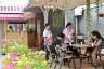 外地游客走累了來到休息區(qū) ,“武林大媽”為她們提供免費涼茶。