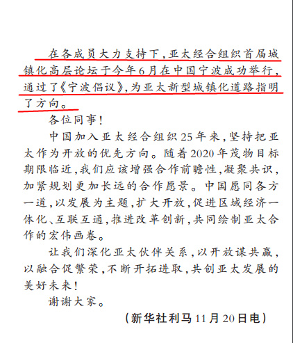 在這篇講話中,習近平主席特別提到了寧波,當中有這樣一段話:“在各成員大力支持下,亞太經合組織首屆城鎮化高層論壇于今年6月在中國寧波成功舉行,通過了《寧波倡議》,為亞太新型城鎮化道路指明了方向。”