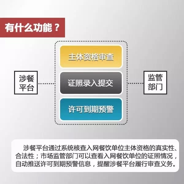也就是說,有了這套智慧監管系統,平臺再也不用擔心碰到假的證照了,一查就能辨真偽;監管部門也能隨時掌握平臺上的餐飲主體情況了,許可證快到期的,通過預警信號提醒平臺,到期還未換證的,二話不說立即下線。