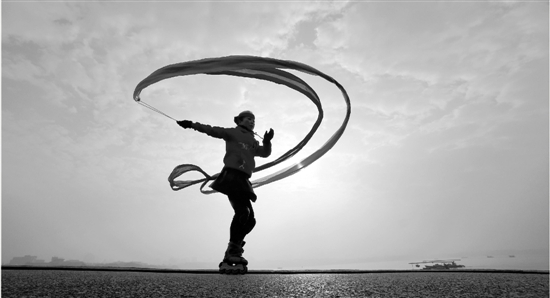 盡管有霧霾,但絲毫不影響市民迎接新年的喜悅。元旦早晨的西湖斷橋上,一位輪滑愛好者在初陽中揮舞彩帶,盡享美好時光。里爾 攝