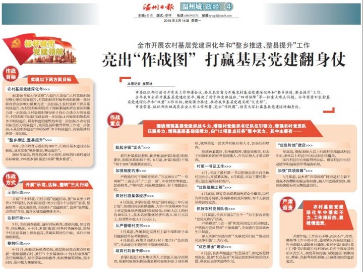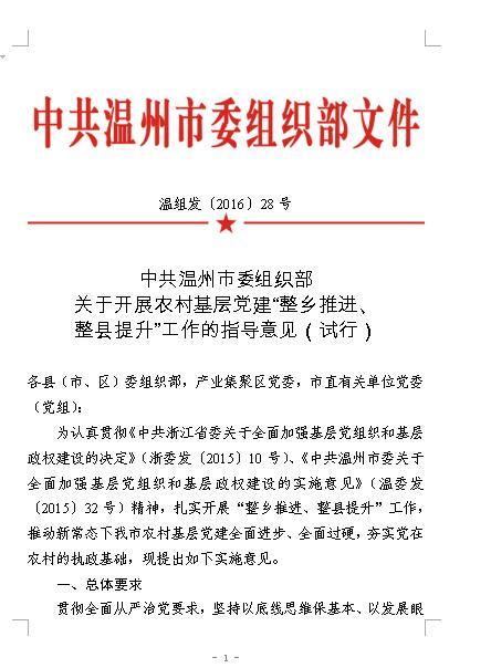 2016年,溫州市按照中央和省委的部署要求,以"兩學(xué)一做"學(xué)習(xí)教育為契機(jī),以"整鄉(xiāng)推進(jìn)、整縣提升"為目標(biāo),深入開(kāi)展農(nóng)村基層黨建深化年,扎實(shí)推進(jìn)"示范、達(dá)標(biāo)、整轉(zhuǎn)"三大行動(dòng),進(jìn)一步打好紅色組合拳,推動(dòng)基層黨建工作全面進(jìn)步、全面過(guò)硬。