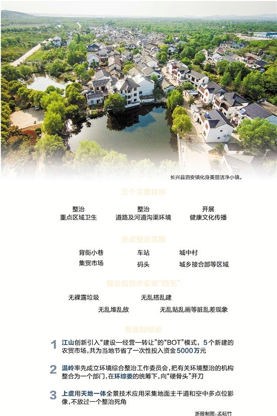 翻開浙江小城鎮環境綜合整治三年行動計劃書,核心任務始終圍繞"一加強、三整治"。加強規劃設計引領,整治環境衛生、整治城鎮秩序、整治鄉容鎮貌,這些重點內容,為補齊小城鎮發展短板指明了方向。