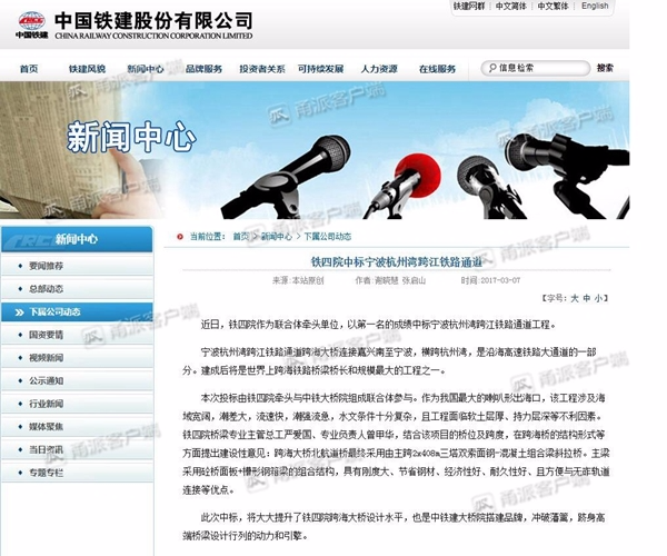 前幾天,中國鐵建股份有限公司官方網站發布消息,其下屬的鐵四院作為聯合體牽頭單位,以第一名的成績中標寧波杭州灣跨江鐵路通道工程。