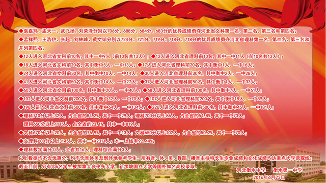 在這里,小編還要特別的解釋一下:衡水第一中學是一所由衡水中學、泰華公司合作新建的民辦高級中學,其管理、師資、招生、教育、教學均以衡水中學為依托。實際上和衡水中學就是"一個學校,統一管理。"