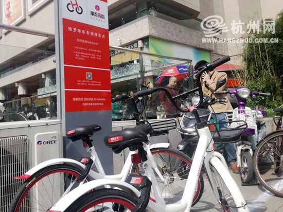 在武林銀泰前,記者看到了一排擺放整齊的Hellobike,并有一塊醒目的顯示牌,是其專用停車點。