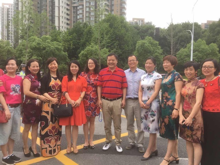 語文考試前,旗袍媽媽和杭二中校長葉翠微為考生加油。 李應全 攝