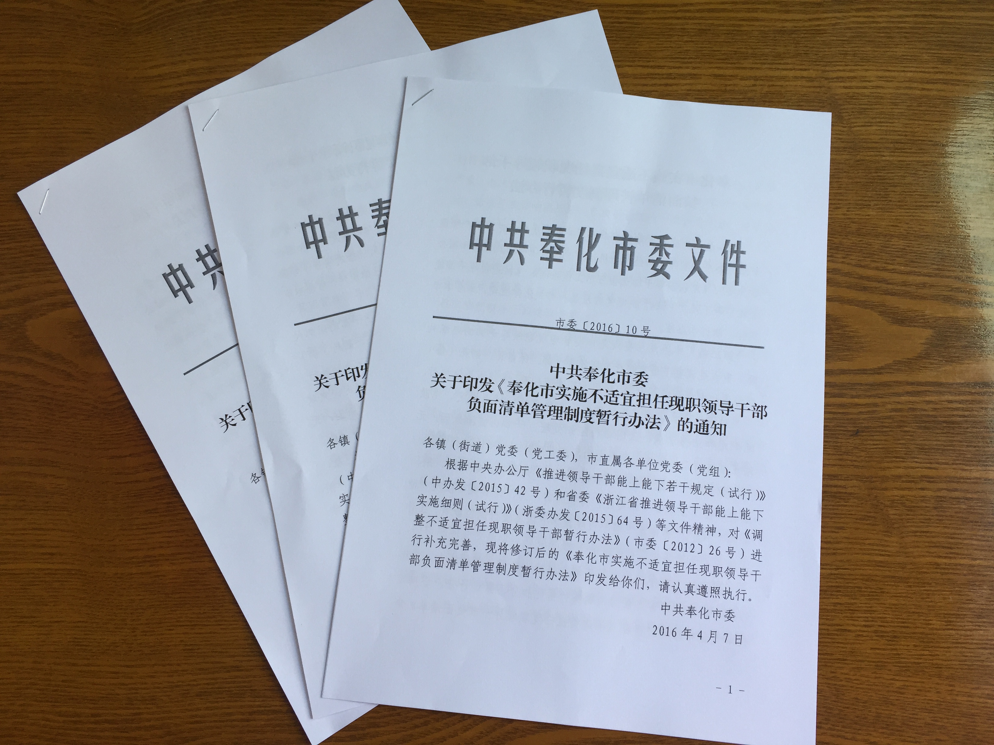 奉化市建立“負面清單60條” 深化推進領導干部“能上能下”機制