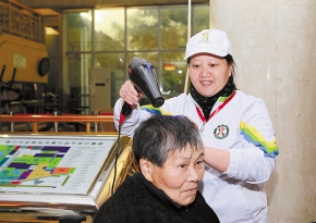 雖然為老人理發要求不高,但是理發師們仍然神情專注、一絲不茍,為老人理出清爽利落的發型。“有一些老人坐著輪椅或臥床不起,洗頭就需要三四個人幫忙,胳膊確實有些酸了。”正在為老人打理的志愿者周鑫依輕聲說,“他們就像我的爺爺奶奶一樣,能幫他們把頭發收拾干凈、清爽,我覺得比什么都快樂。”