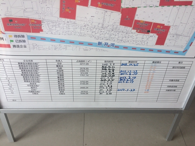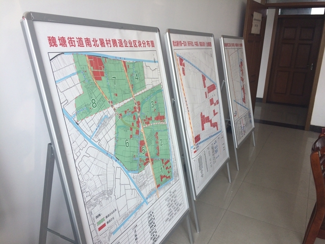 騰退,勢(shì)在必行。魏塘街道迅速出擊,發(fā)動(dòng)企業(yè)主體,村級(jí)配合實(shí)施,街道發(fā)力推動(dòng),縣級(jí)部門(mén)聯(lián)掛助力,以雷霆之速,推進(jìn)騰退工作。縣、街道、村三級(jí)聯(lián)動(dòng),在南北暑村設(shè)立作戰(zhàn)室,全面摸底,僅花一月時(shí)間摸清轄區(qū)企業(yè)分布情況,分區(qū)域形成八張騰退作戰(zhàn)圖。走進(jìn)南北暑村環(huán)境綜合整治作戰(zhàn)室,只見(jiàn)八張圖一圈排開(kāi),將作戰(zhàn)室圍了起來(lái)。仔細(xì)查看,每塊圖上詳細(xì)標(biāo)明區(qū)域地塊,大塊紅色標(biāo)出騰退企業(yè)區(qū)域,寫(xiě)明了各家企業(yè)名稱(chēng),圖末貼著一張表格,將企業(yè)負(fù)責(zé)人、占地面積、騰退時(shí)間等信息逐一列出。