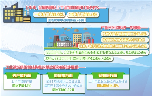 上半年,工業領域供給側結構性改革政策效應初步顯現:去產能扎實推進,降成本擲地有聲,補短板抓鐵有痕,積極的跡象明顯增多。值得一提的是,工業領域不同產業間、同一產業內部分化加快,這是經濟發展的客觀規律使然,也是市場引導的作用,更是推動結構優化的良機。