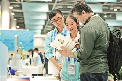 G20杭州峰會新聞中心9月1日正式開放。圖為一位外國媒體人士在新聞中心內的展臺前向志愿者了解《習近平談治國理政》一書。記者 焦翔 攝