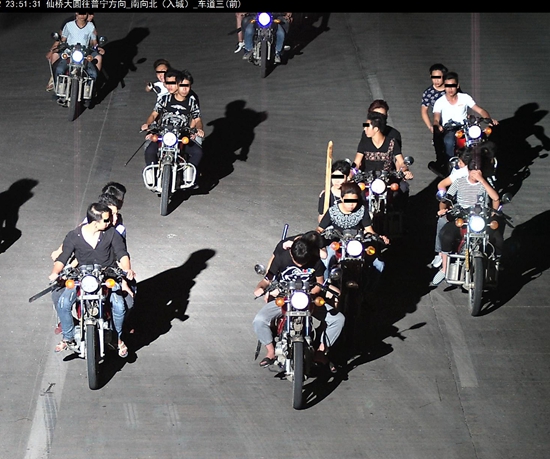 警方提供的監控視頻截圖顯示,2015年4月30日夜,廣東揭陽,一群90后騎著摩托車在公路上上演“速度與激情”,手持砍刀、九環刀等無端毆打砍傷路人。視覺中國供圖(資料照片)