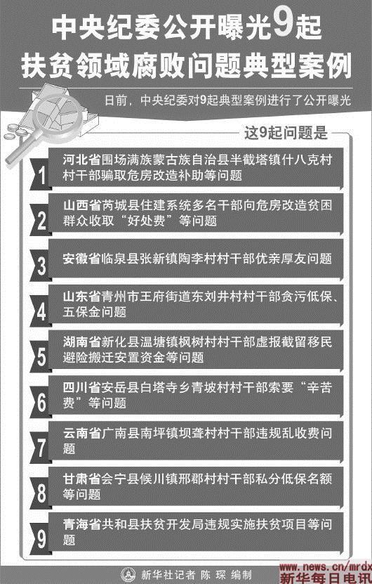 今年以來,中央紀委強化扶貧領域監督執紀問責,持續開展多輪次、滾動式重點督辦,各級紀檢監察機關以紀律保障扶貧,嚴肅查處扶貧領域腐敗問題。日前,中央紀委對9起典型案例進行了公開曝光。分別是: