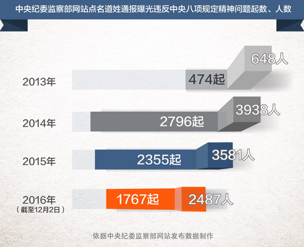 截至2016年12月2日,四年間,中央紀委監察部網站“違反中央八項規定精神問題監督舉報曝光專區”已持續通報各類“四風”問題7392起,10654人被點名道姓公開曝光,日均通報曝光7.3人。