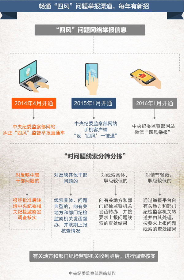 四年間,從開通網站“糾正‘四風’監督舉報直通車”,到開通手機客戶端“反‘四風’一鍵通”和微信“四風舉報”平臺,中央紀委監察部“一網一端一微”形成強大的監督力量;與此同時,各級紀檢監察機關也搭上新媒體新技術的“快車”,開門搞監督,形成無處不在的監督網,推動了“不敢”氛圍的形成。各級紀檢監察機關通過強化實招、探索新招,讓中央八項規定精神在不斷鞏固和深化中落地生根。