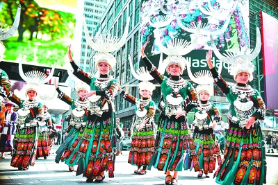 貴州雷山苗家歌舞亮相美國紐約時代廣場。 光明圖片/視覺中國