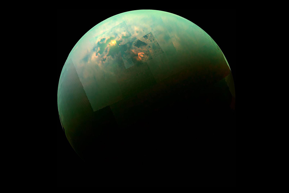 “卡西尼”號太空探測器拍攝的土衛六“泰坦”紅外線照片。土衛六(左下)的個頭比地球小,比月亮大。它是太陽系里除地球以外,唯一表面擁有液體海洋的星球。(網頁截圖)