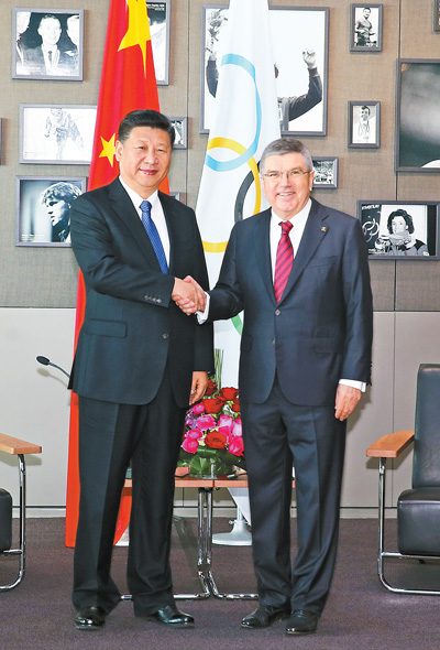 習近平指出,長期以來,國際奧委會和巴赫主席、羅格名譽主席為國際奧林匹克運動健康發展作出了重要貢獻,也為中國體育事業提供了巨大幫助,我對此表示贊賞。中國堅定支持并積極參與奧林匹克運動。北京是世界上第一個既舉辦過夏季奧運會、又將舉辦冬季奧運會的城市。這是中國的貢獻。籌辦北京冬季奧運會是中國今后幾年一項重大工作。我們將堅持綠色辦奧運、共享辦奧運、開放辦奧運、廉潔辦奧運。中國愿同國際奧委會一道,把北京冬季奧運會辦成一屆精彩、非凡、卓越的奧運盛會。