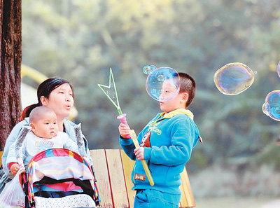 在河南省鄭州市碧沙崗公園,一位母親正一邊抱著二孩,一邊帶大孩玩耍。