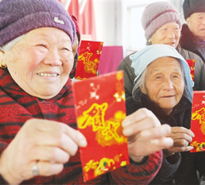 安徽亳州古井鎮減店村,老人在領取新年“紅包”。