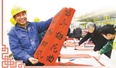 江蘇鎮江金山街道風車山社區,外來務工人員在展示志愿者為他們寫的春聯。