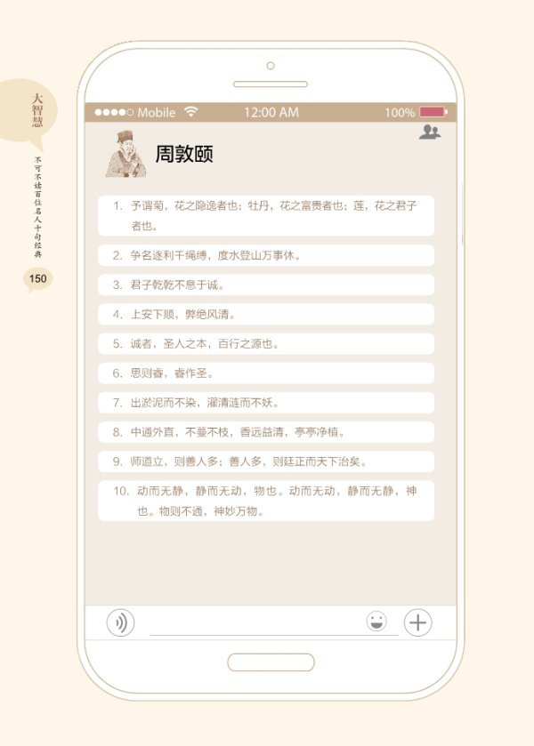3年前,經作者授權,浙江人民出版社開始籌備出版事宜。版式,借鑒微信元素,讓讀者感受到手機閱讀的親切感;內容,請畫家作畫,增添名人的民間想象,畫家范曾等欣然手書警句墨寶;同時,考慮到朋友圈的半私密性,征得每個人同意后,對圈中好友的頭像及網名進行技術處理,頭像統一采取有版權的攝影作品代替。