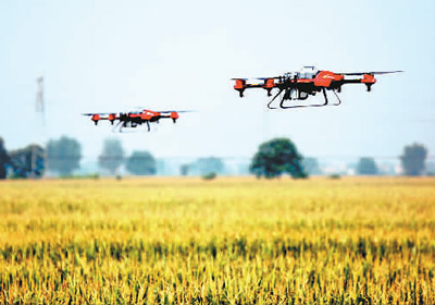 2016年8月12日,陜西省渭南市金坡村,人們使用無人機噴灑農藥。